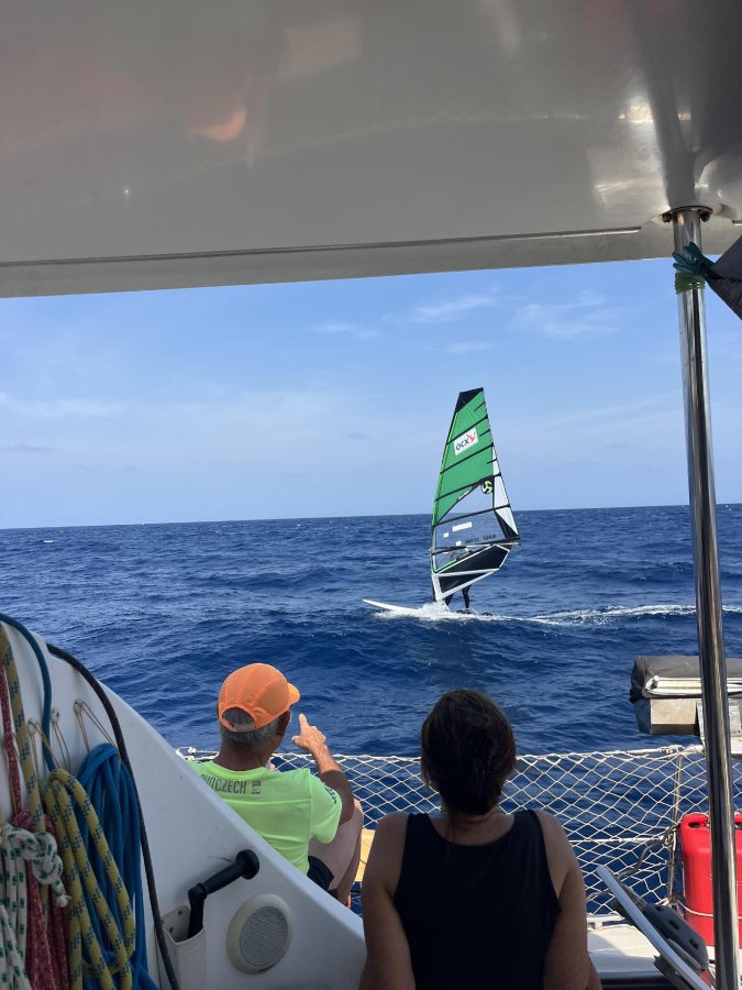 Journée un peu longue du à la puissance du vent qui a faibli, ce qui oblige Olivier a trouver l’équilibre sur la planche par manque de vitesse.