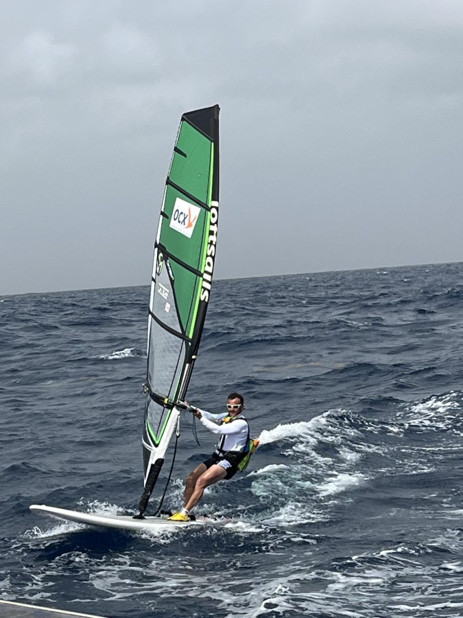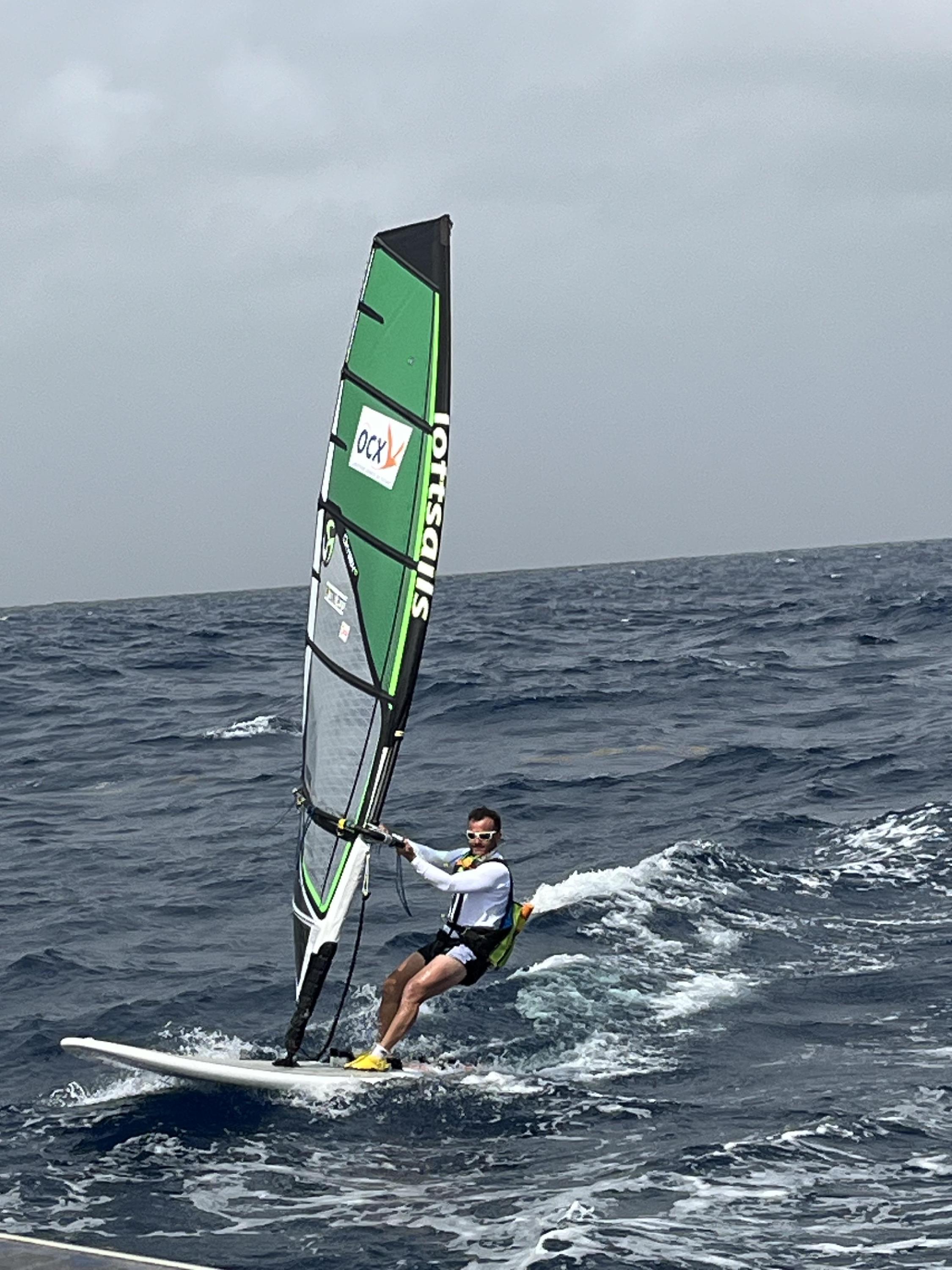 Pour notre dixième journée de navigation depuis le départ de Dakar, aujourd’hui nous avons bénéficié d’un vent d’orage qui a permis à Olivier du prendre du plaisir sur sa planche, nous pouvons même avouer que c’est bien la première fois qu’Olivier a apprécié cette navigation à juste titre.