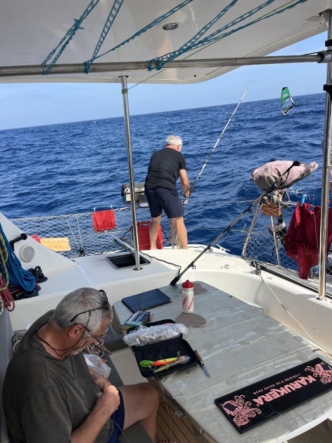 PS: l'image du jour, tous a sa tâche, Olivier sur sa planche, le Doc à la pêche et le Skipper à démêler les leurres accrochés à son tee-shirt