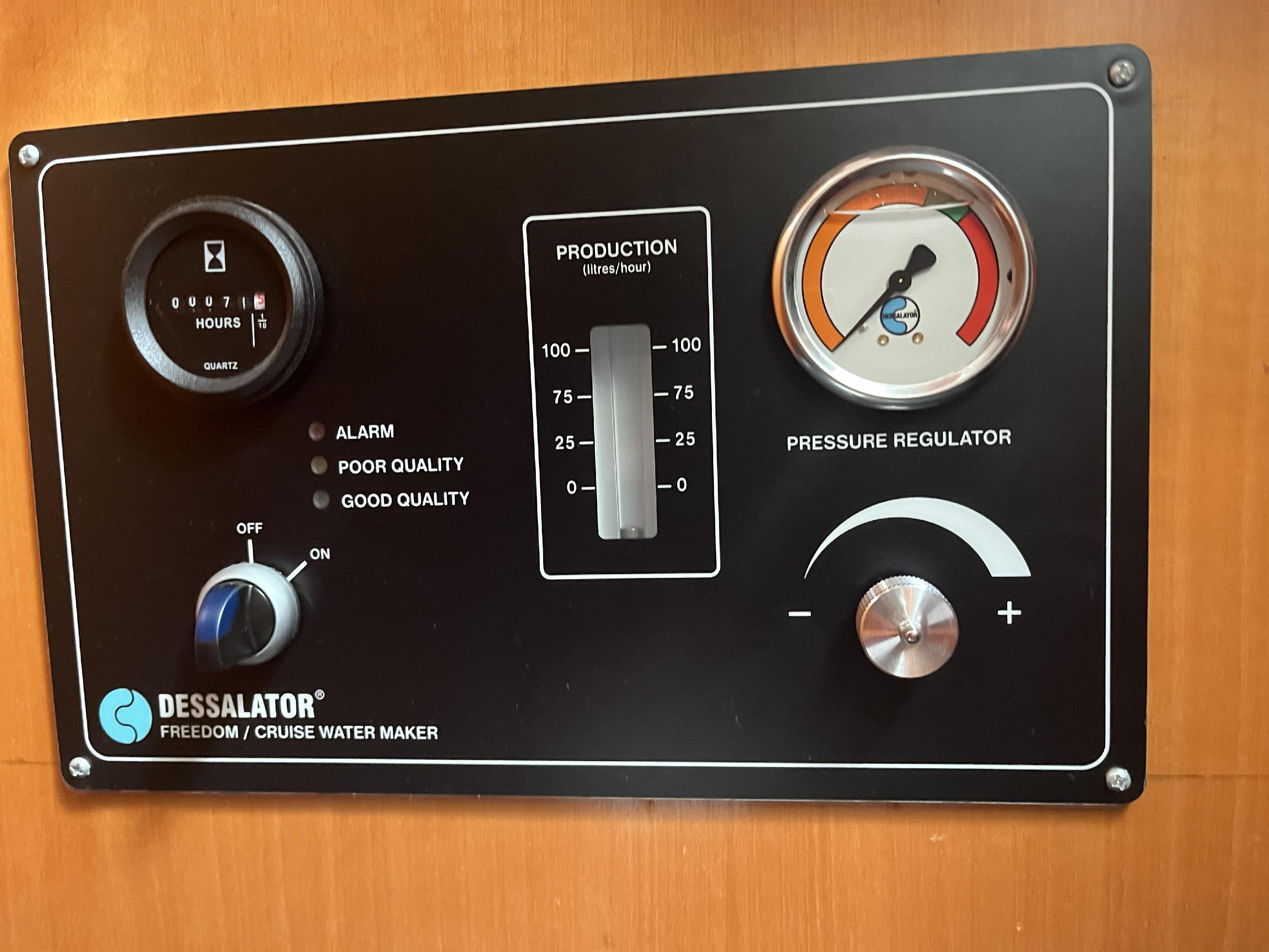 Imaginez 5 personnes sous la chaleur des tropiques, qui on besoin de s’hydrater, de se laver et de faire la cuisine pendant 30 jours minimum. Il serait impensable de stocker la quantité d’eau, d’abord le poids que cela représenterait, et la place. C’est pourquoi nous avons un « Dessalinisateur, ou water maker » qui nous permet à partir de l’eau de mer de fabriquer de l’eau douce, potable et complètement purifiée, à un rythme de 100 litres par heure de fonctionnement sur les batteries du bord. Malgré cela, nous avons quand même embarqué 250 litres d’eau douce en bidon d’eau minérale de 10 litres chaque, au cas où nous aurions un problème technique, qui peut toujours arriver et la sécurité c’est de prévoir. En résumé nous consommons environs 100 litres par jours en faisant très attention. Les douches se font sur la plage arrière à l’eau de mer, et juste un petit rinçage à l’eau douce.