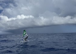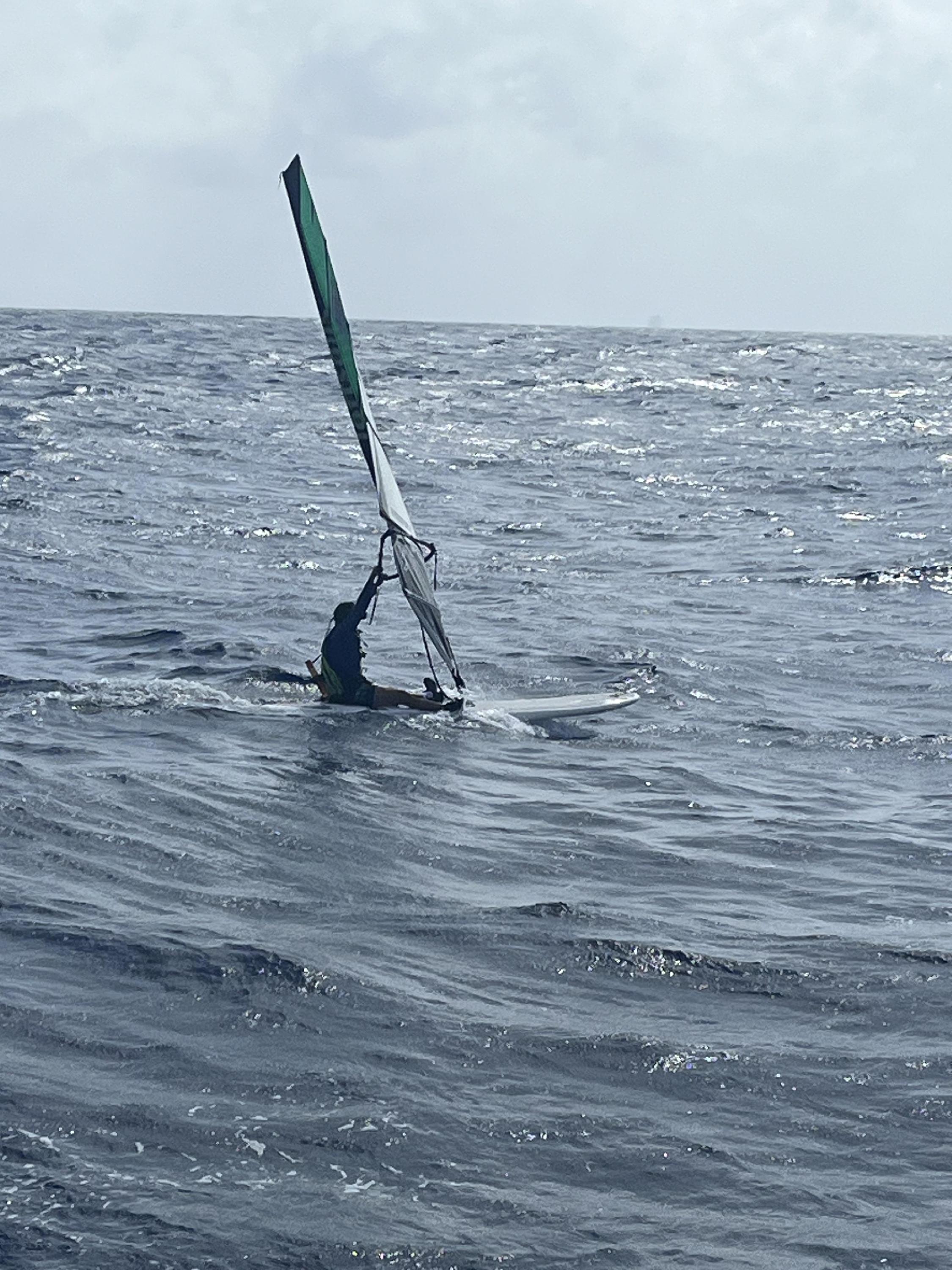 Pour finir en beauté, notre Olive a fini assis, car cette journée a été ponctuée de petites pannes, ça reste un sport mécanique, heureusement qu’il reste que 2 jours, car le matériel a souffert. Et nous avons dû faire des ronds dans l’eau pour changer de voile, le diabolo pied de mat, et imaginer l’humeur de notre planchiste ( à bord nous avons pris l’habitude, plus rien nous touche)